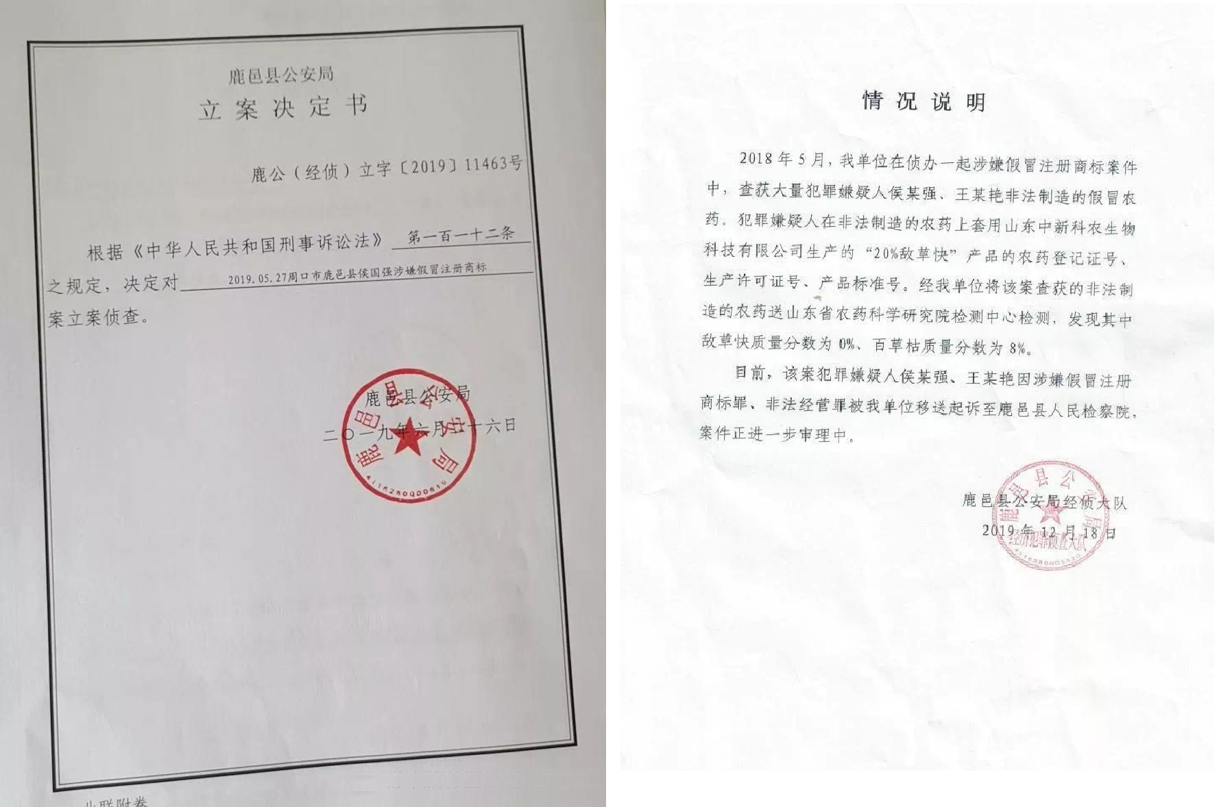 2020年7月28日,中新科农收到了河南省鹿邑县人民法院关于盗用中新科农敌草快水剂登记证案件的刑事判决书。