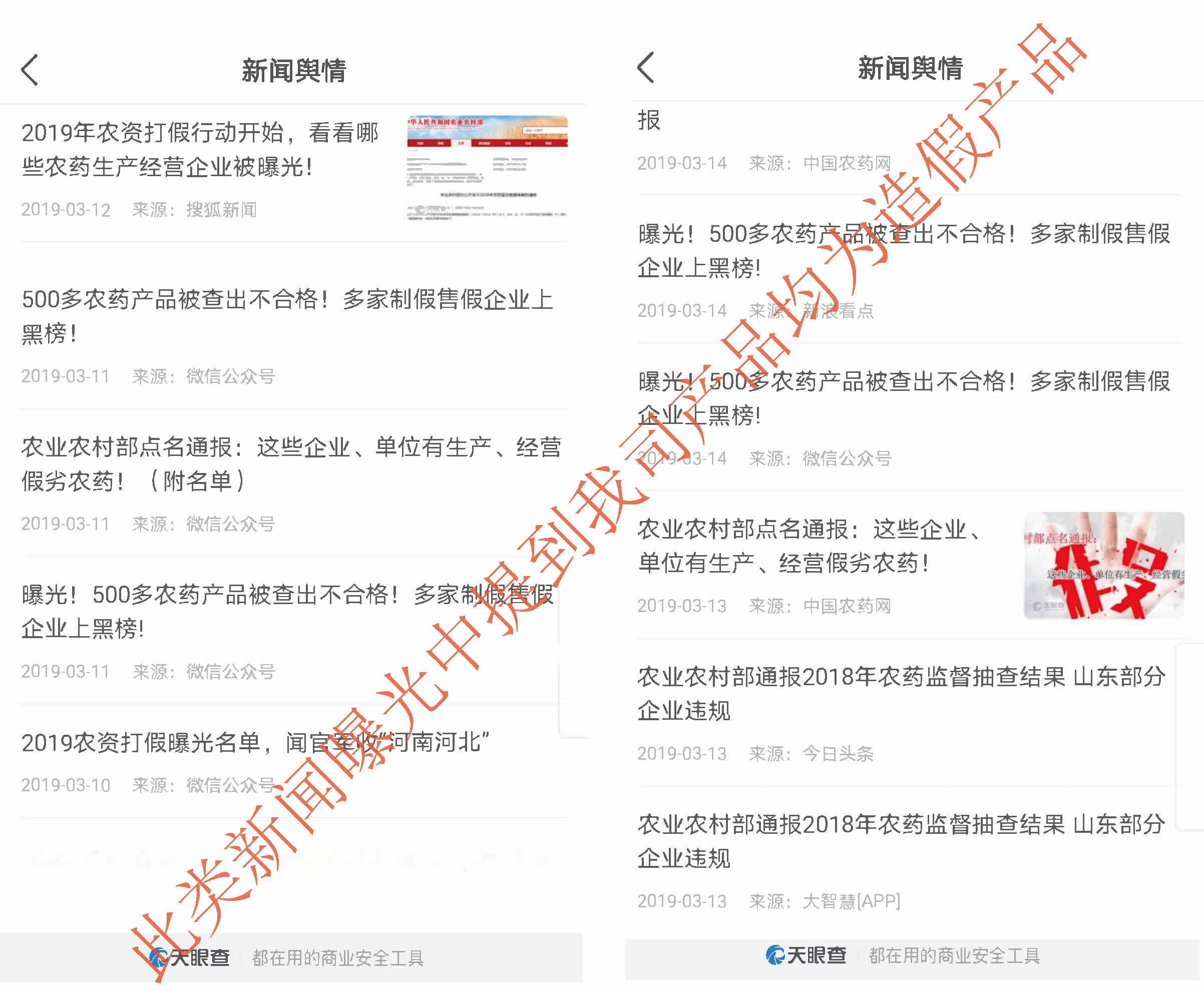 因为犯罪分子造假,假冒的20%敌草快水剂在2018年度农药监督抽查中被抽中检查并被报告为不合格产品,很多不明真相的人误以为如上被抽检的不合格敌草快水剂是中新科农生产。甚至有部分媒体曲解宣传,发布了像《曝光!500多农药产品被查出不合格!多家制假售假企业上黑榜!》这样的文章,并被多家不明真相的媒体转载。尽管我司于2019年3月9日紧急发布了《关于盗用中新科农20%敌草快水剂登记证件的严正声明》,然而,收效甚微,仍有不明真伪的人认为抽检的敌草快产品是我司生产。