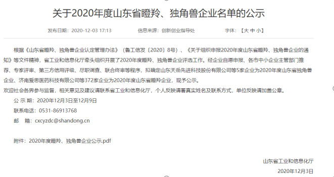 根据《山东省瞪羚、独角兽企业认定管理办法》(鲁工信发〔2020〕8号)、《关于组织申报2020年度山东省瞪羚、独角兽企业的通知》等文件精神,经省工业和信息化厅牵头组织开展评选工作,由企业申报、市中小企业主管部门推荐、专家评审、第三方信用评级等程序组织考核,共有372家企业通过2020年度山东省瞪羚企业,我公司名列榜中,这是对中新科农的高度认可,充分说明了公司具有成长速度快、创新能力强、发展潜力大的特点。