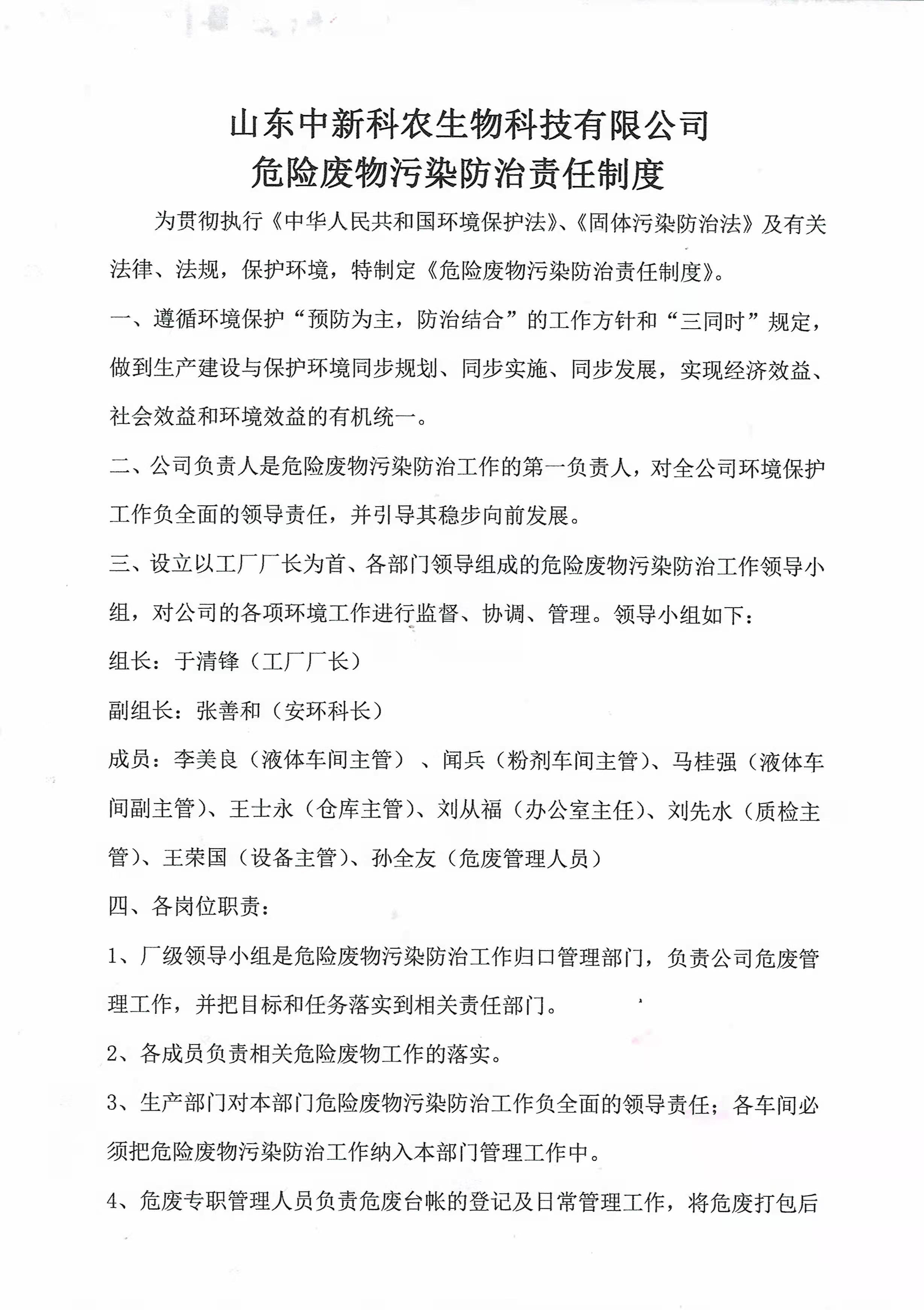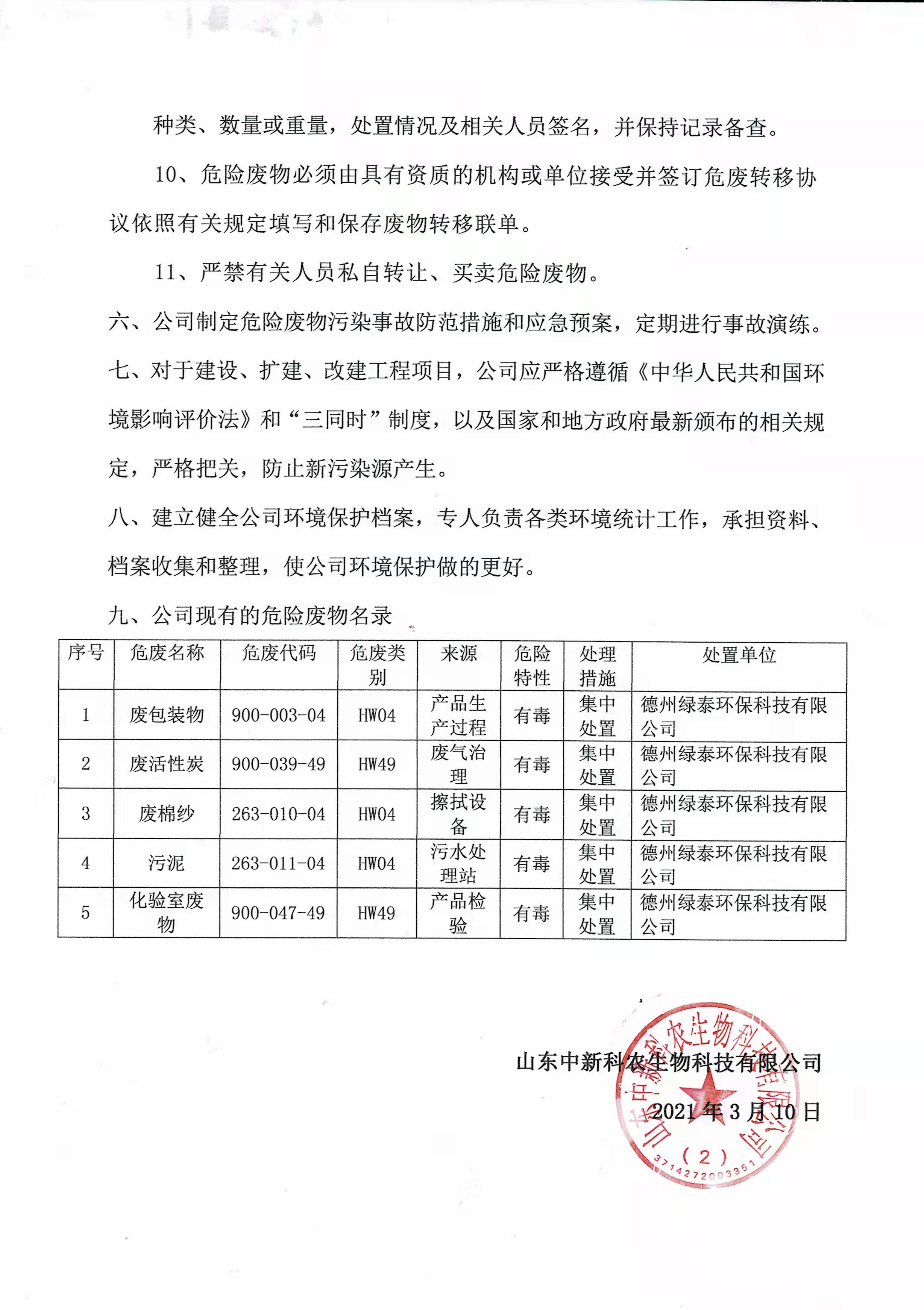 2021年度山东中新科农生物科技有限公司危险废物污染环境防治信息